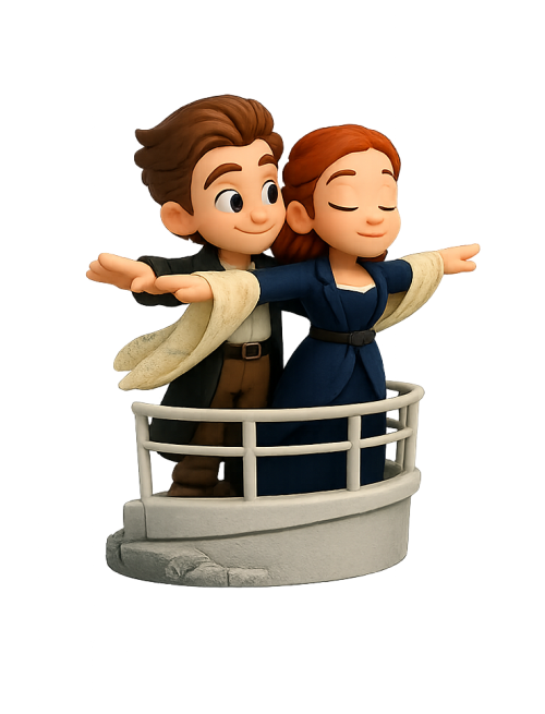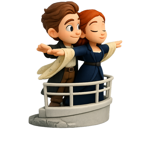 Inspirada em uma das cenas mais icônicas do cinema romântico, esta miniatura retrata o casal em um momento inesquecível sobre o convés, transmitindo leveza, emoção e conexão — perfeita para fãs de filmes clássicos e colecionadores.